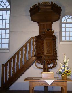 Unsere Kanzel aus Eichenholz wurde vor dem Jahr 1572 hergestellt und 1989 restauriert. Der Tisch in der Mitte der Kirche wurde 1990 aus Eichenholz hergestellt, nachdem sein Vorgänger nicht mehr erhalten worden war.